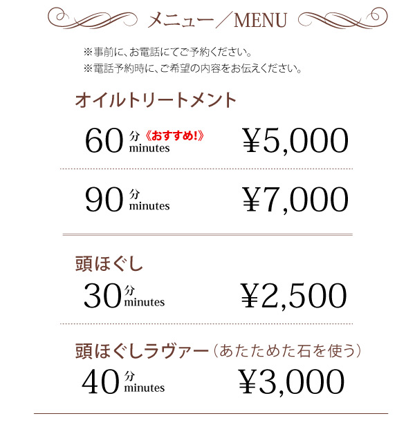 《オイルトリートメント》 お客様より大好評いただいているオイルトリートメントです。 オイルの効能とともに、全身の血液・リンパの流れを整え、体が持つ自然治癒力や免疫力を高めます。オイルを使ってリンパの流れに沿ってマッサージすることで、しっかりと老廃物を流し、心身の疲れを取り除いていきます。 むくみの解消や疲労回復、免疫力の向上も期待できます。 《頭ほぐし》 頭をほぐすことで、血液の流れがよくなり、老廃物がうまく流れるようになります。全身の疲れを取り、自律神経を整えるといった効果も期待できます。 《頭ほぐしラヴァー》 あたためた石をつかって頭をほぐしていきます。いつも考え事が多い、目が疲れやすい、寝不足の方に効果的です。 |